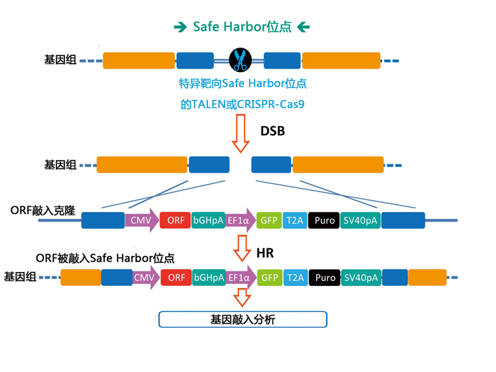 特異靶向 safe harbor 位點(diǎn)的 TALEN 或 CRISPR-Cas9 能在基因組的 safe harbor 位點(diǎn)上生成 DNA 雙鏈斷裂(DSB),誘發(fā) DNA 的自然修復(fù)機(jī)制,促使該位點(diǎn)與對應(yīng)的 ORF 敲入克隆之間發(fā)生同源重組(HR)(圖1),將 ORF 敲入克隆上的 DNA 片段整合到基因組的 safe harbor 位點(diǎn)。
