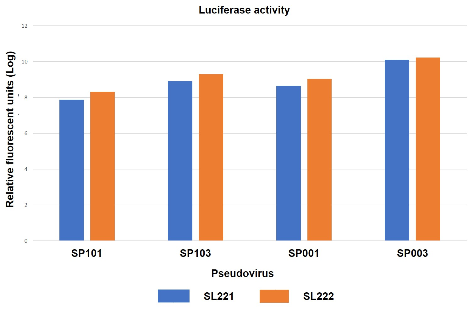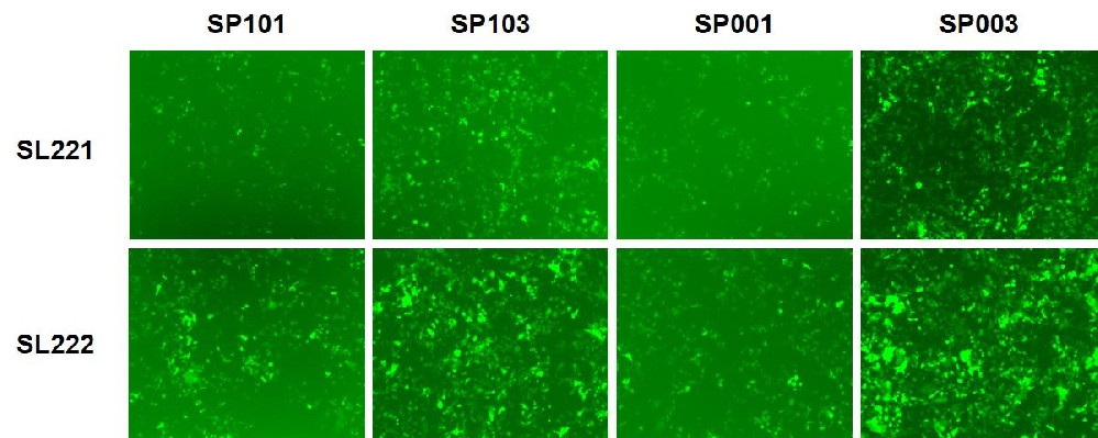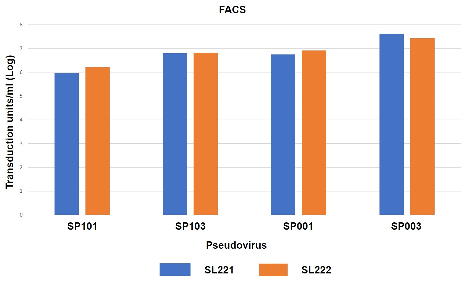 圖1. 用表達eGFP/hLuc的SARS-CoV-2 S假慢病毒(假病毒)轉(zhuǎn)導表達ACE2-或ACE2/TMPRSS2的HEK293T細胞。用10 μl假病毒在96孔板中轉(zhuǎn)導每個細胞系。轉(zhuǎn)導72小時后,在熒光顯微鏡下對細胞進行拍照,隨后測量熒光素酶活性或進行FACS分選。SL221:表達ACE2的HEK293T細胞。SL222:表達ACE2和TMPRSS2的HEK293T細胞。SP101:全長S蛋白,D614變體。SP103:全長S蛋白,D614G變體。SP001:截短S蛋白,D614變體。SP003:截短S蛋白,D614G變體。A. 熒光顯微鏡。B. 熒光素酶活性測定。使用GeneCopoeia的Luc-Pair? Firefly Luciferase HS Assay Kit(貨號LF007),從假病毒轉(zhuǎn)導細胞培養(yǎng)物中提取20 μl細胞裂解液,分析螢火蟲熒光素酶活性,用FACS分選法測定轉(zhuǎn)導的單位滴度units/ml。