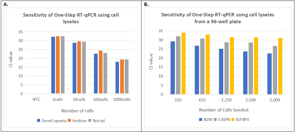 A.在試管中的應(yīng)用,使用GeneCopoeia、Ambion或BioRad的裂解緩沖液裂解HCT116細(xì)胞,使用GAPDH基因進(jìn)行RT-qPCR分析。取濃度范圍為5 ~ 5000個(gè)細(xì)胞每微升的懸浮細(xì)胞與裂解緩沖液混合,按照各產(chǎn)品的操作說(shuō)明書進(jìn)行處理。每RT-qPCR反應(yīng)使用2μl細(xì)胞裂解液(相當(dāng)于1-1000個(gè)細(xì)胞每反應(yīng))。