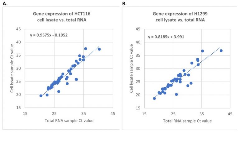 圖二:使用常規(guī)RNA提取法及CytoCt?裂解法分別處理相同數(shù)量的細(xì)胞,通過(guò)One-Step RT-qPCR檢測(cè)基因表達(dá)情況。每個(gè)反應(yīng)的細(xì)胞量約為1500個(gè)。A. 檢測(cè)HCT116細(xì)胞中的42個(gè)基因。B. 檢測(cè)H1299細(xì)胞中的37個(gè)基因。