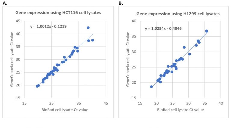 圖三:使用Genecopoeia(縱坐標(biāo))和BioRad(橫坐標(biāo))的lysis buffer分別處理相同數(shù)量的細(xì)胞,通過(guò)One-Step RT-qPCR檢測(cè)基因表達(dá)情況。每個(gè)反應(yīng)的細(xì)胞量約為1500個(gè)。A. 檢測(cè)HCT116細(xì)胞的43個(gè)基因。B. 檢測(cè)H1299細(xì)胞中的37個(gè)基因。
