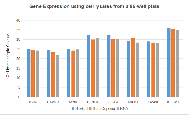 圖四:在96孔板中使用細(xì)胞裂解液進(jìn)行多基因檢測(cè)。將3000 – 5000個(gè)HEK293細(xì)胞接種在96孔板中培養(yǎng),至細(xì)胞達(dá)到70% – 90%的豐度。分別使用GeneCopoeia、BioRad的裂解液以及RNA提取試劑按使用說(shuō)明處理等量細(xì)胞,使用一步法RT-qPCR試劑,檢測(cè)8個(gè)基因的表達(dá)。