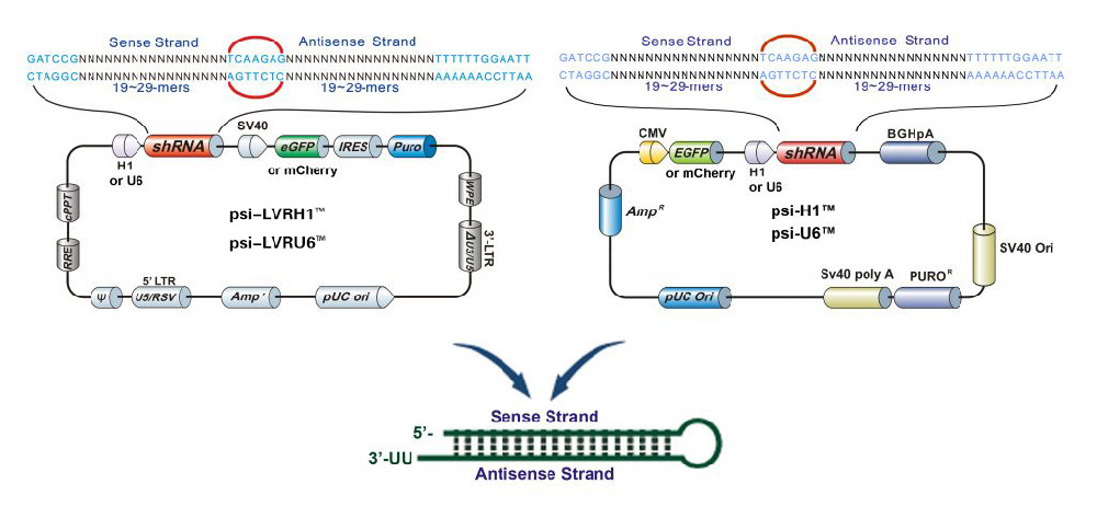 復(fù)能基因提供病毒和非病毒載體的人、小鼠和大鼠全基因組OmicsLink? shRNA表達克隆,shRNA序列經(jīng)專利算法設(shè)計包括莖(19-29對核苷酸)和環(huán),確保高效的抑制作用和最低的脫靶效應(yīng)。